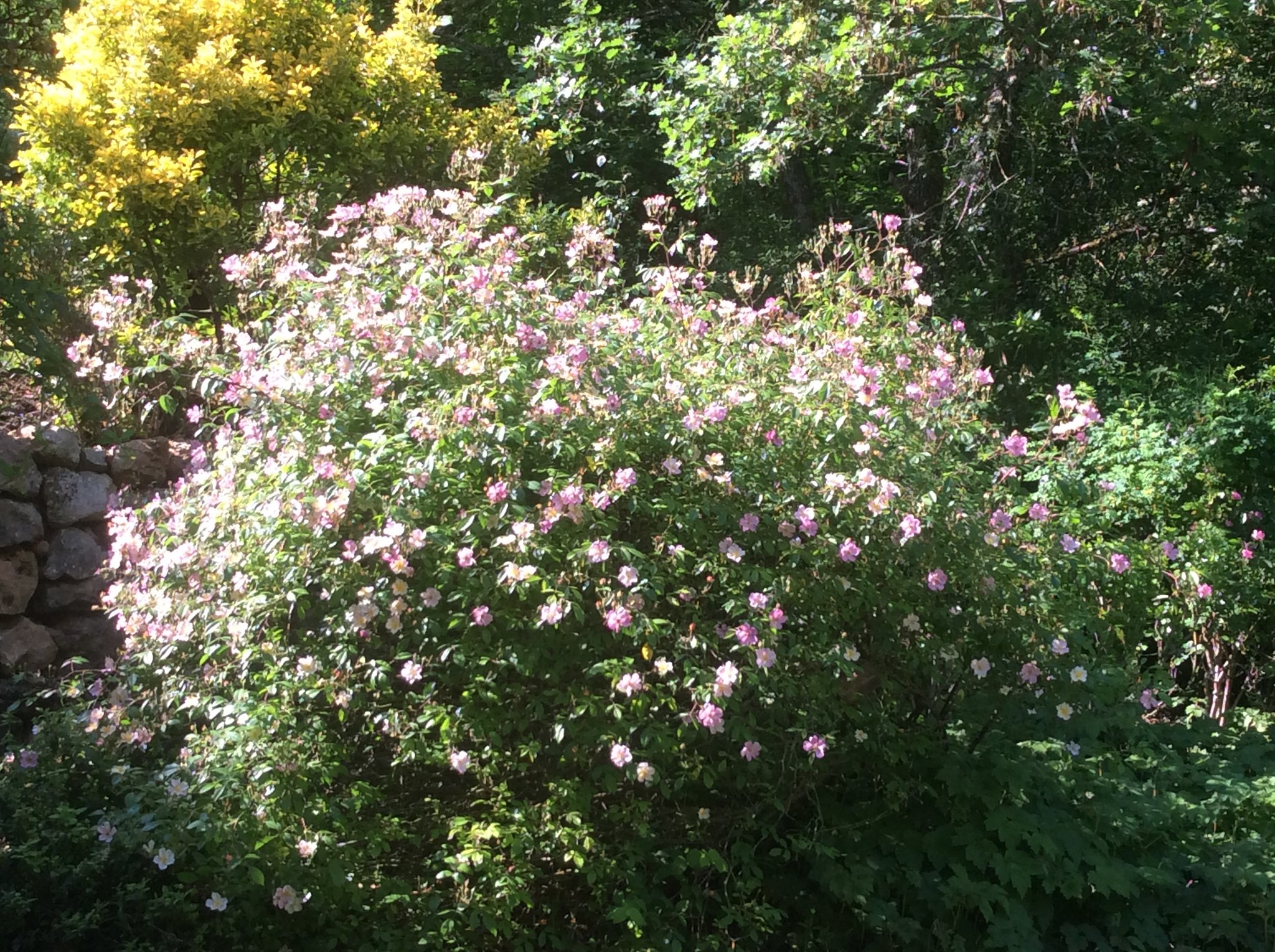JJDQ n°2 : dans le "jardin de Neil", petit jardin créé en 2019 : la fontaine rose et le banc près du céanothe. Ailleurs, statue Primavera remise en place après l'hiver. Rosier "Plaisanterie", hâtif, fleurs simples et multiples, remontant. Peu connu, hélas... (Jean Donies/les Jardins du Quercy).